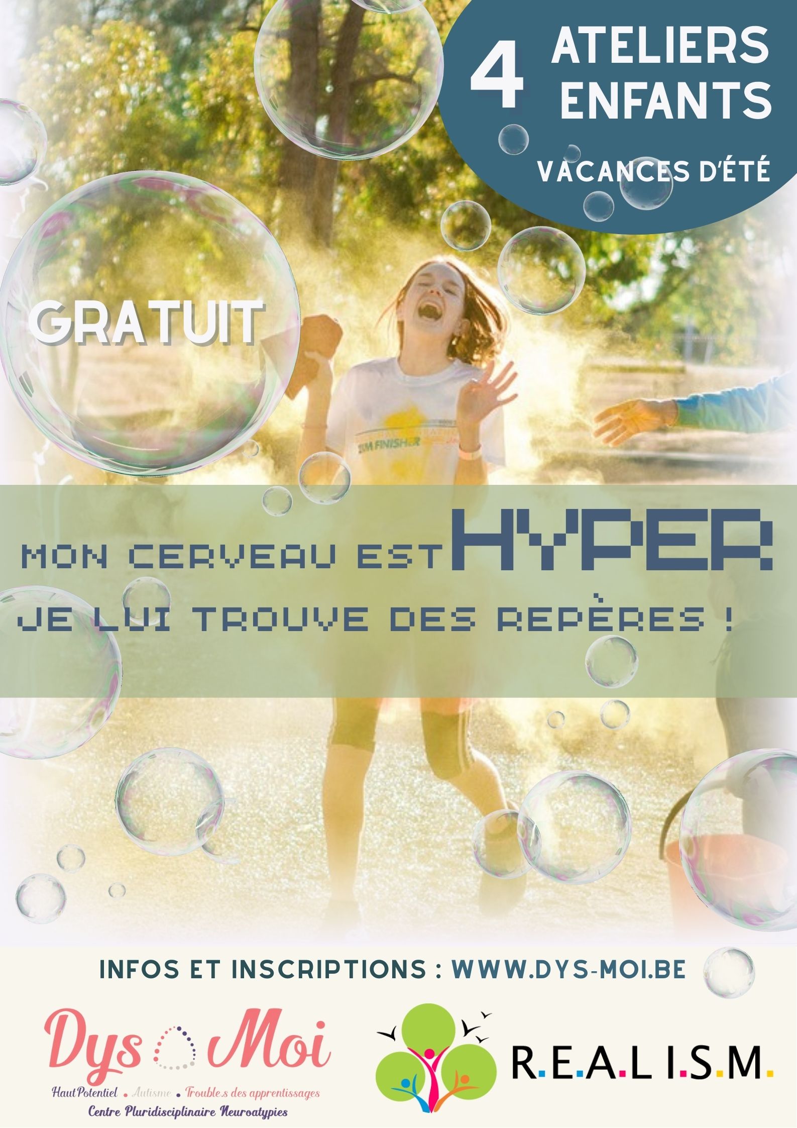 Cet été, nous proposons un cycle de 4 ateliers pour les enfants neuroatypiques âgés de 6 à 12 ans (primaire), afin de les aider à mieux comprendre le fonctionnement de leur cerveau hyper et à trouver des repères pour vivre un quotidien plus apaisé.
