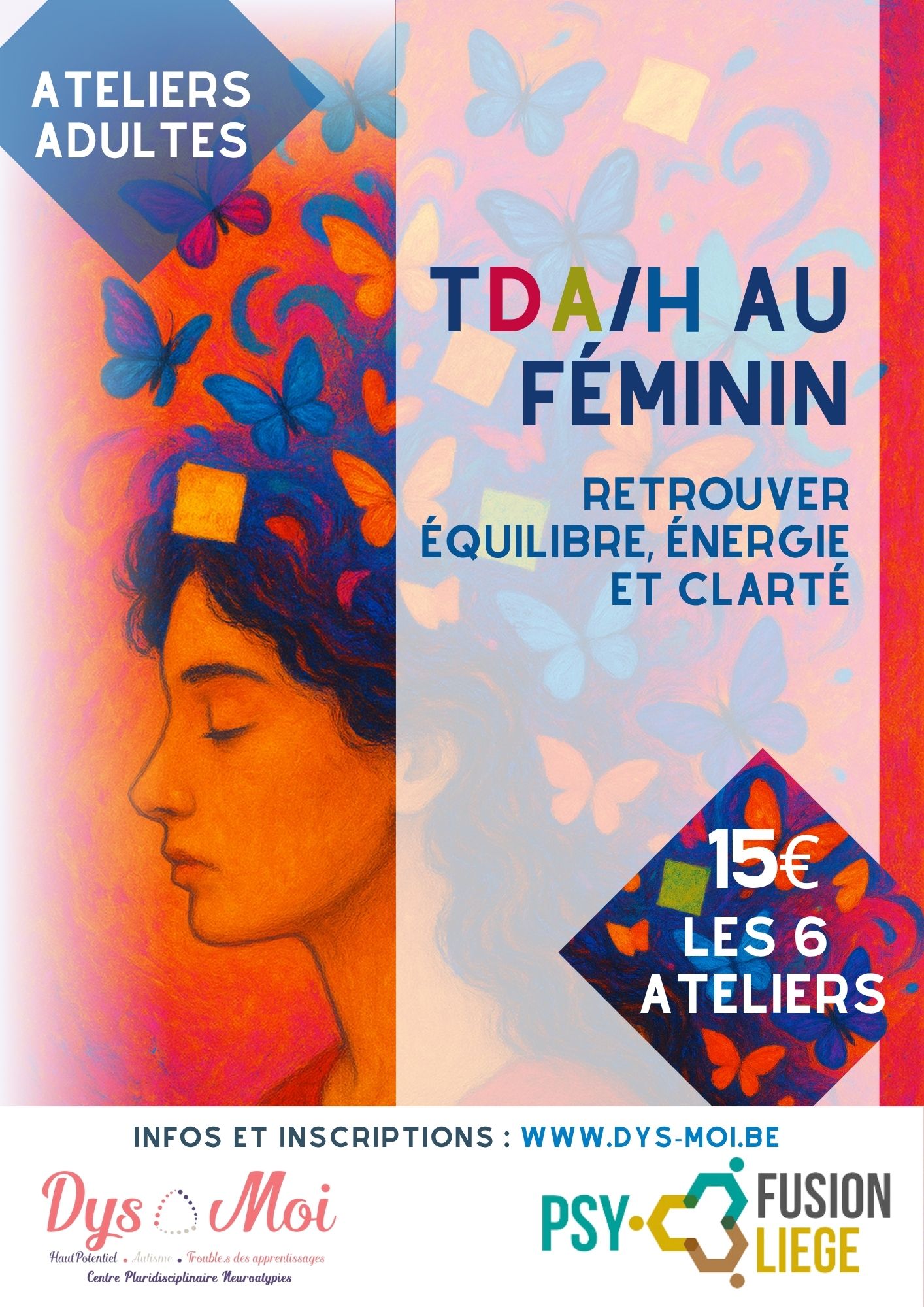 Le Trouble Déficitaire de l’Attention avec ou sans Hyperactivité (TDAH) chez les femmes se manifeste souvent de manière spécifique : surcharge mentale, difficultés d’organisation, impulsivité émotionnelle, fatigue chronique, sentiment de ne « jamais en faire assez ». Ces réalités sont fréquemment invisibles et peuvent générer de la culpabilité, une faible estime de soi et des difficultés relationnelles. Cet atelier thérapeutique mieux comprendre son fonctionnement, développer des stratégies concrètes d’adaptation, renforcer son estime de soi et sa confiance, explorer des techniques de recentrage corporel et énergétique.